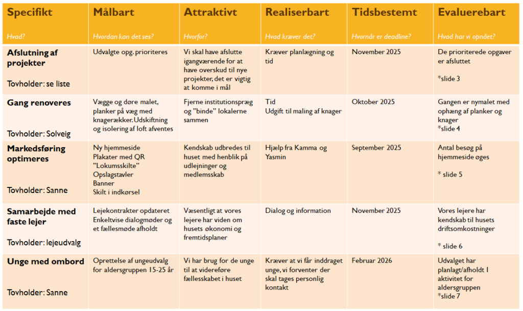 Vi udvælger hver år vores SMARTE mål, som er de punkter vi ønsker at prioritere særligt i løbet af året. I 2025 er de SMARTE mål: